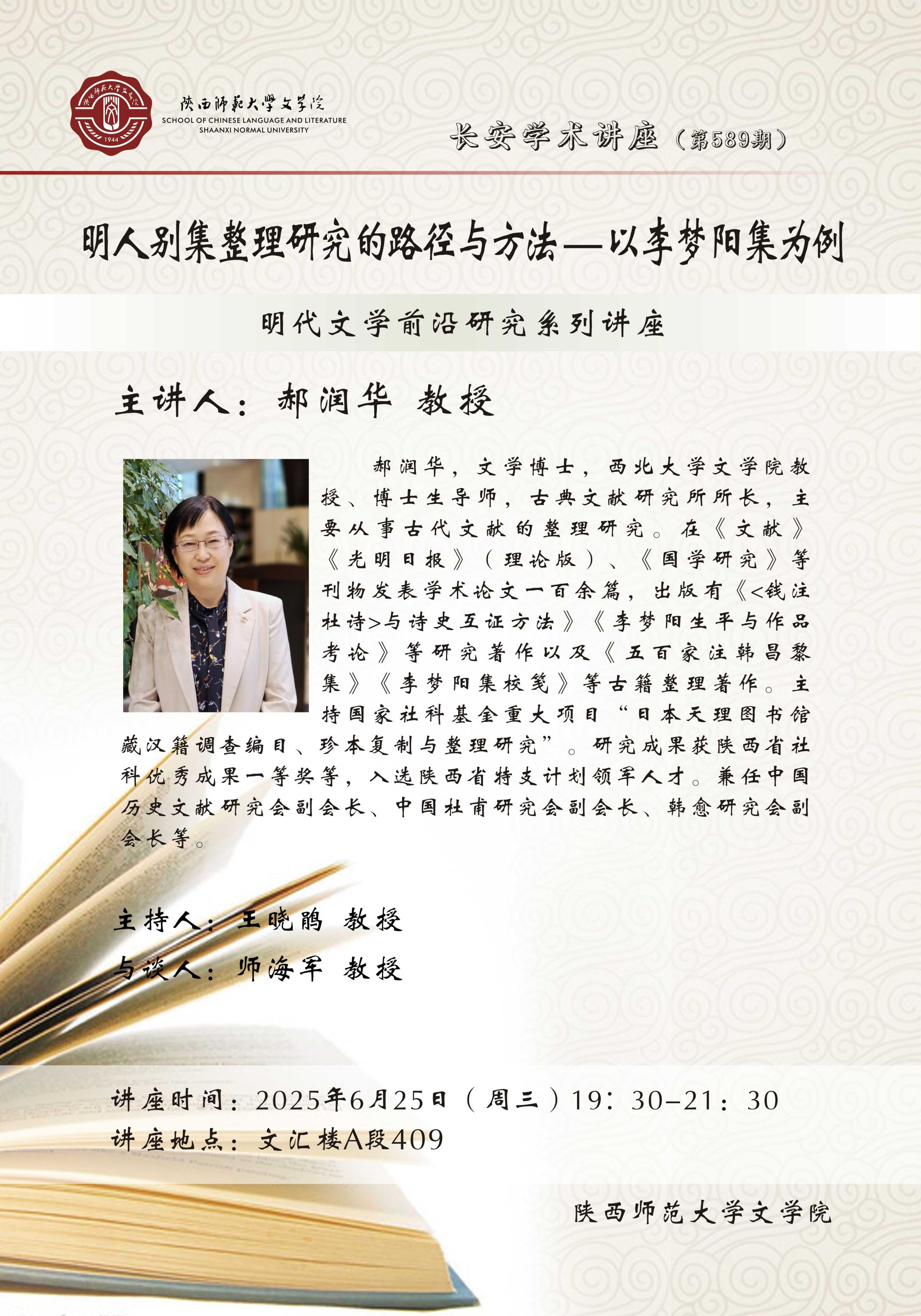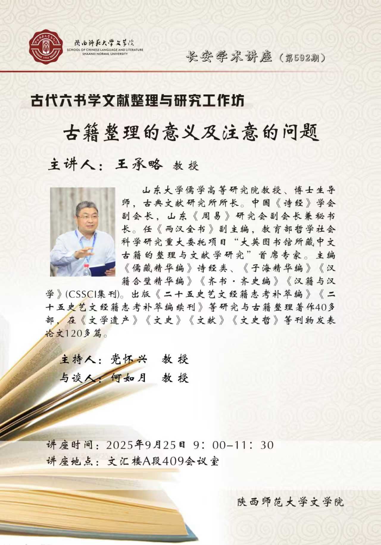 (通讯员:董春萌)9月25日上午,公司第592期长安学术讲座顺利举办,山东大学儒学高等研究院博士生导师、古典文献研究所所长王承略教授主讲“古籍整理的意义及注意的问题”。公司党怀兴教授主持,周淑萍教授与谈,申博SUNBET相关教师和专业研究生参加了讲座。王承略教授从新中国成立以来古籍整理事业、新时代古籍整理的特殊意义以及古籍整理应注意的问题入手,阐释古籍整理的发展历程。王承略教授指出,古籍是中华优秀传统文化的主要物质载体,...