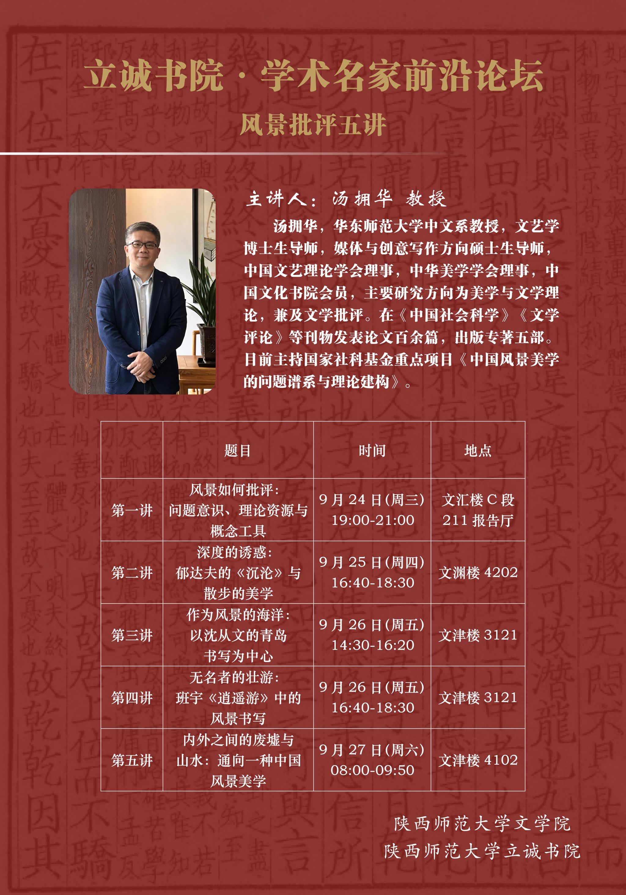 为进一步提升拔尖人才培养质量,营造浓郁学术氛围,公司于本学期开设“立诚书院·学术名家前沿论坛”,邀请著名学者聚焦学术前沿话题,为公司师生开设系列课程。2025年9月24日至27日,华东师范大学中文系教授汤拥华首讲“风景批评五讲”。公司程国君老师、冯超老师、任杰老师、童一菲老师、魏欣怡老师和何卓伦老师以及三百余名本硕博员工学习了本课程。24日晚,公司李跃力经理出席开课仪式并致欢迎辞。他指出风景研究是当下学术界的前沿话题,...