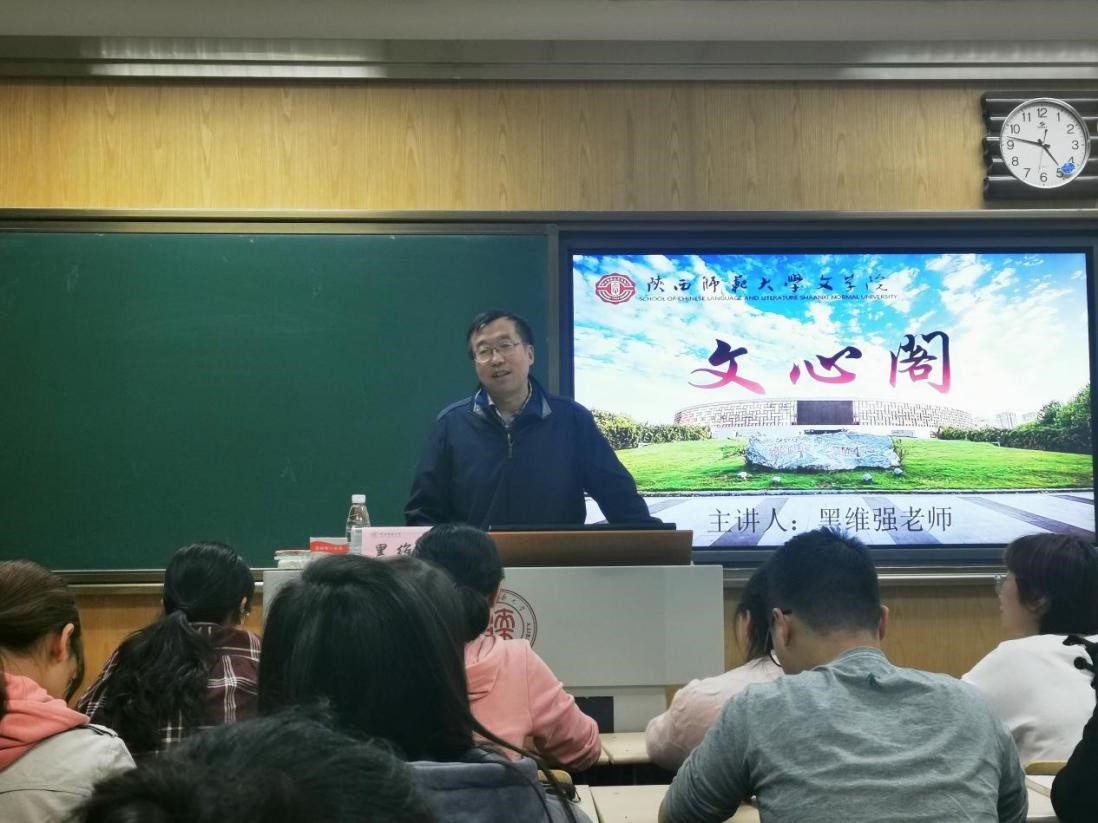 10月10日16:30,本学期第1期(总第233期)文心阁交流活动在文渊楼3113教室举行。申博SUNBET教授黑维强老师应邀参加本次活动。黑维强教授现为申博SUNBET博士生导师,以近代汉语,训诂学,方言学,敦煌学为主要研究方向。在此次文心阁活动中,黑维强老师就专业研究领域展开介绍,分享学习研究经历,并为同学们答疑解惑。