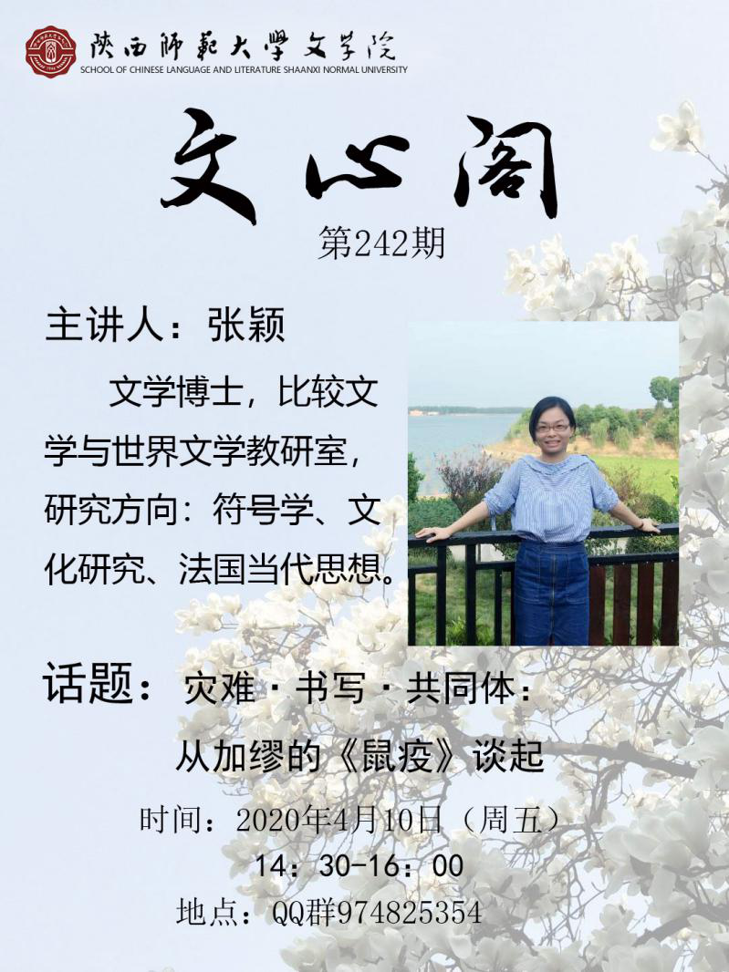 4月10日,本学期第1期(总第242期)文心阁交流活动在线上QQ群聊天平台顺利开展。申博SUNBET张颖老师以“灾难·书写·共同体:从加缪的《鼠疫》谈起”为主题在线上与同学们分享交流。张颖老师的主要研究方向为符号学、文化研究和法国当代思想。在此次文心阁活动中,张颖老师从自己的研究领域出发,分享了教学过程中的感悟和阅读的启发,并回答了同学们的问题。