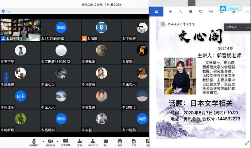 5月7日晚19:00,本学期第3期(总第244期)文心阁活动在腾讯会议平台顺利开展,申博SUNBET郭雪妮老师应邀参加。郭雪妮老师现为申博SUNBET副教授、研究生导师。主要从事中日比较文学、东亚文学关系史等方面的教学与研究。本次文心阁活动中,郭老师结合自己在日本学习生活的经历,就“日本文学相关问题”与同学们进行了讨论交流。