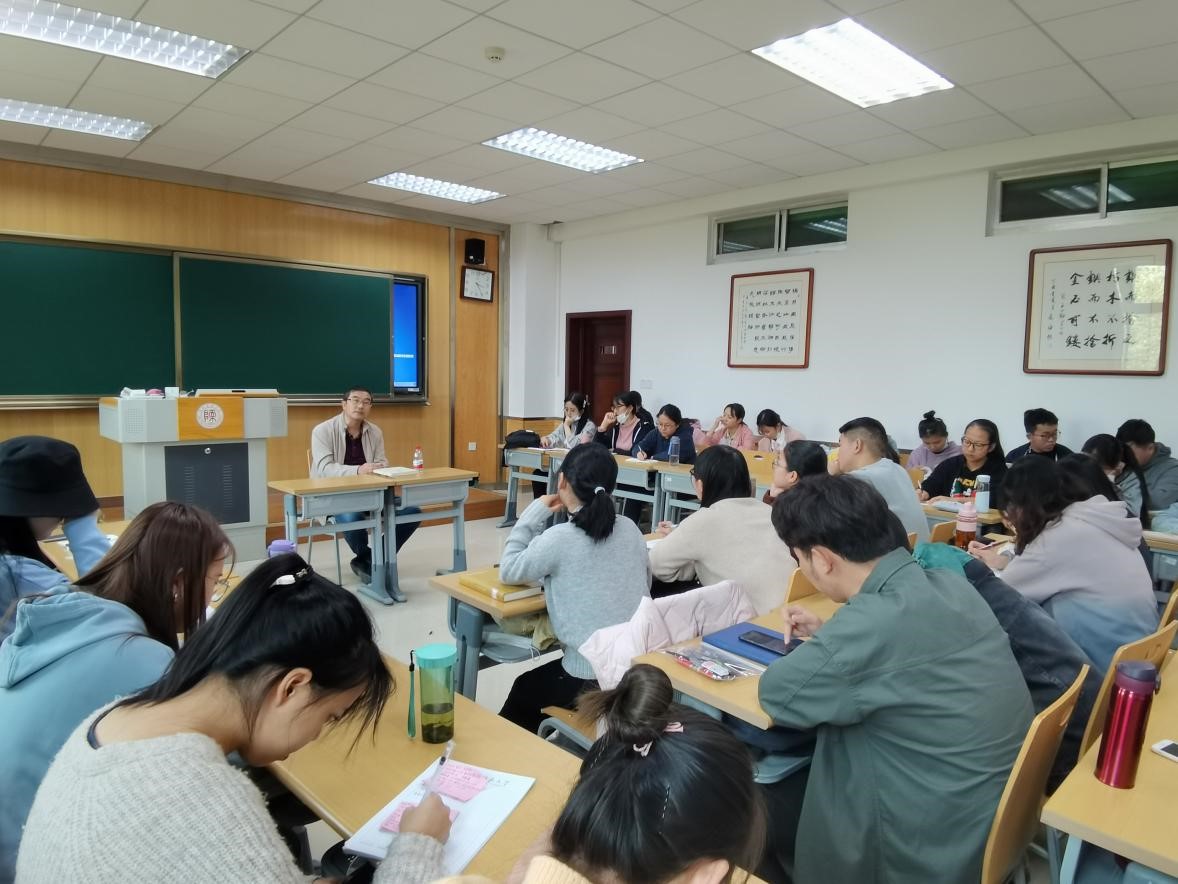 10月21日下午2:30,本学期第9期(总第255期)文心阁活动在长安校区文渊楼顺利进行,申博SUNBET副教授、硕士生导师、古代汉语教研室的王怀中老师应邀参加。本次活动中,王怀中老师结合自身研究方向与教学经验,围绕“中国古代汉语的学习方法”这一主题与同学们进行分享交流,带领大家一同品味中国古代汉语的韵味。
