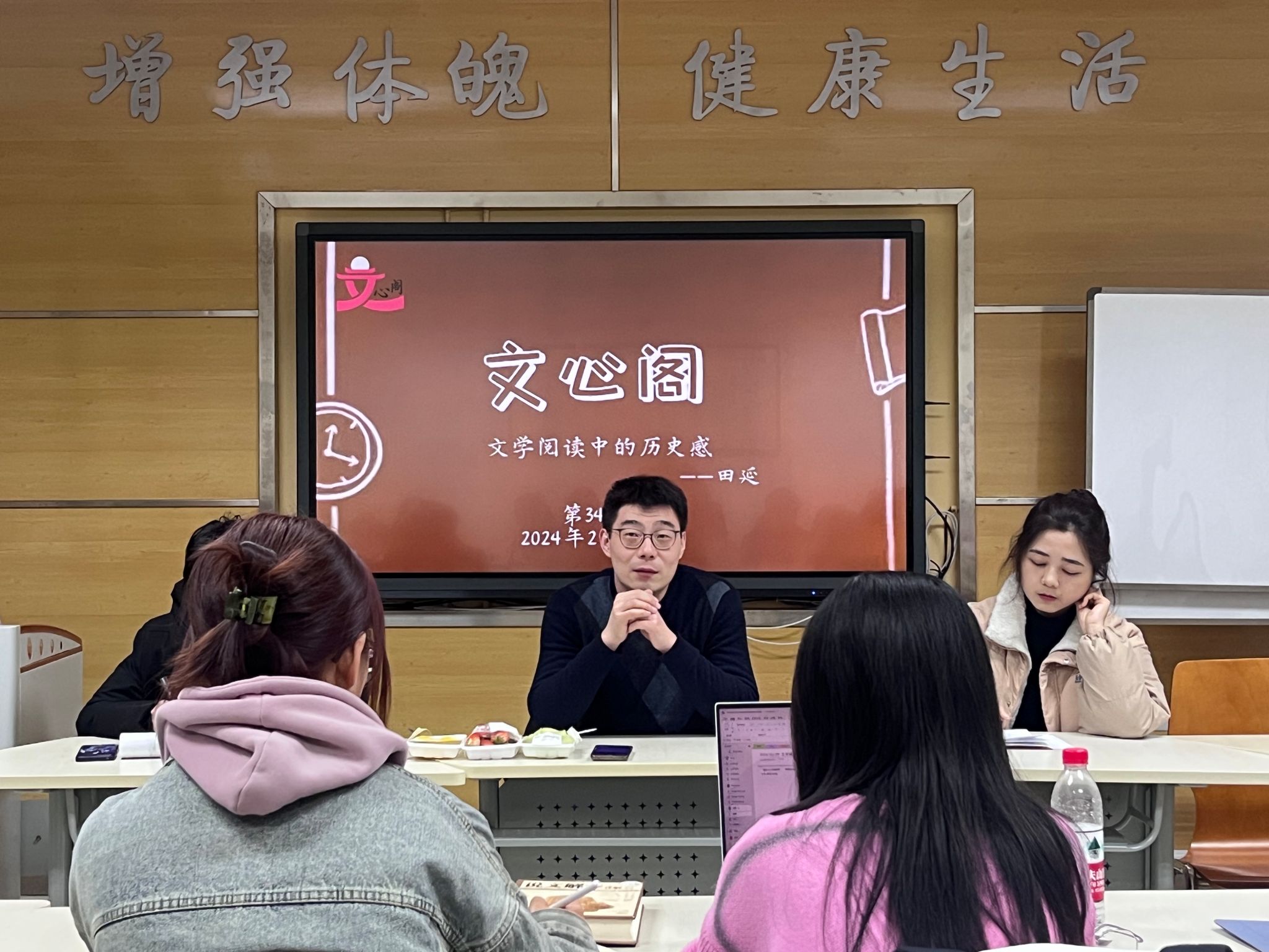 2月29日,本学期第1期(总第340期)文心阁活动在长安校区文渊楼1202教室顺利举办。申博SUNBET文艺学教研室田延老师以“文学阅读中的历史感”为主题,和同学们分享自己阅读时的体悟。