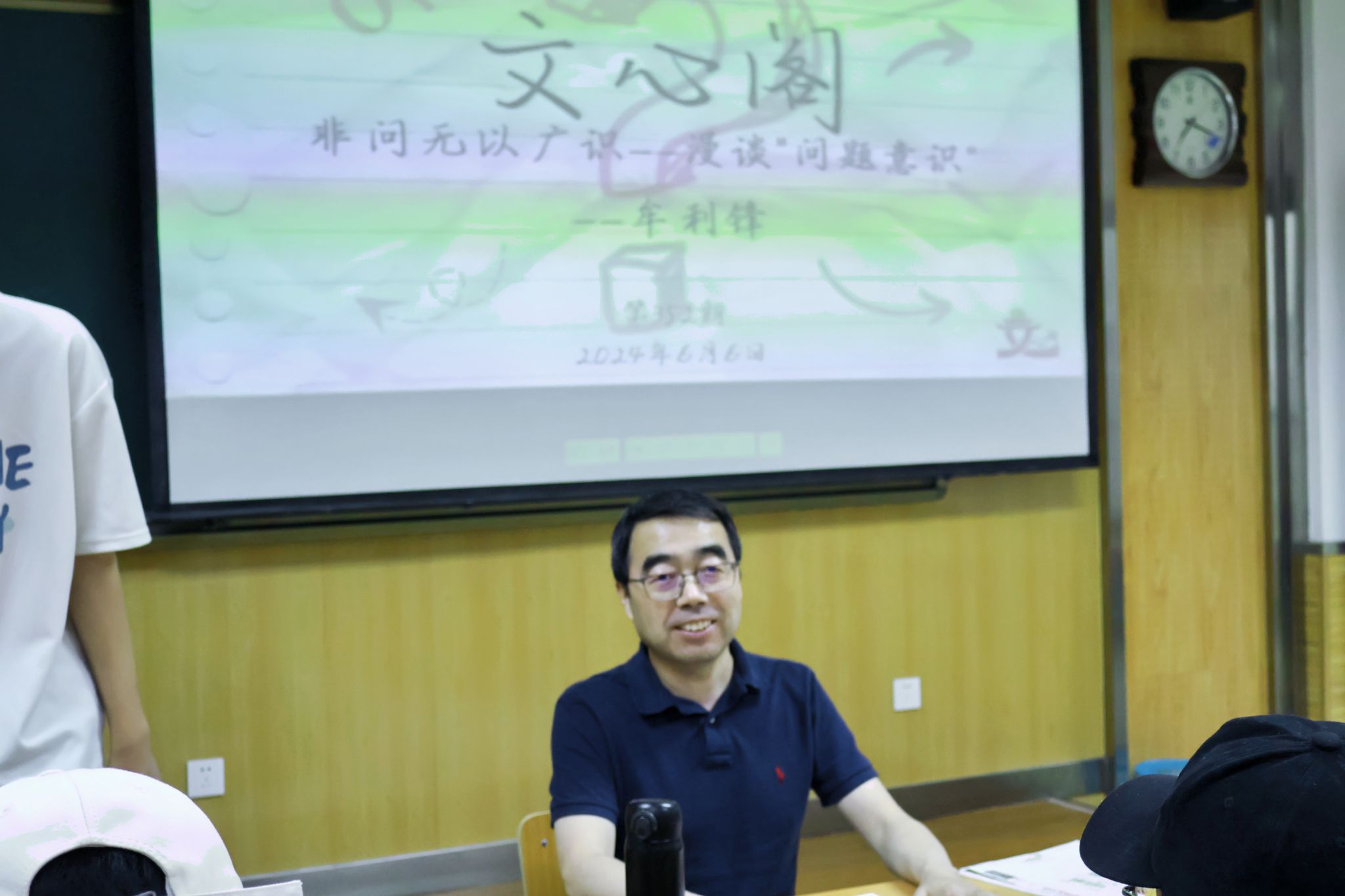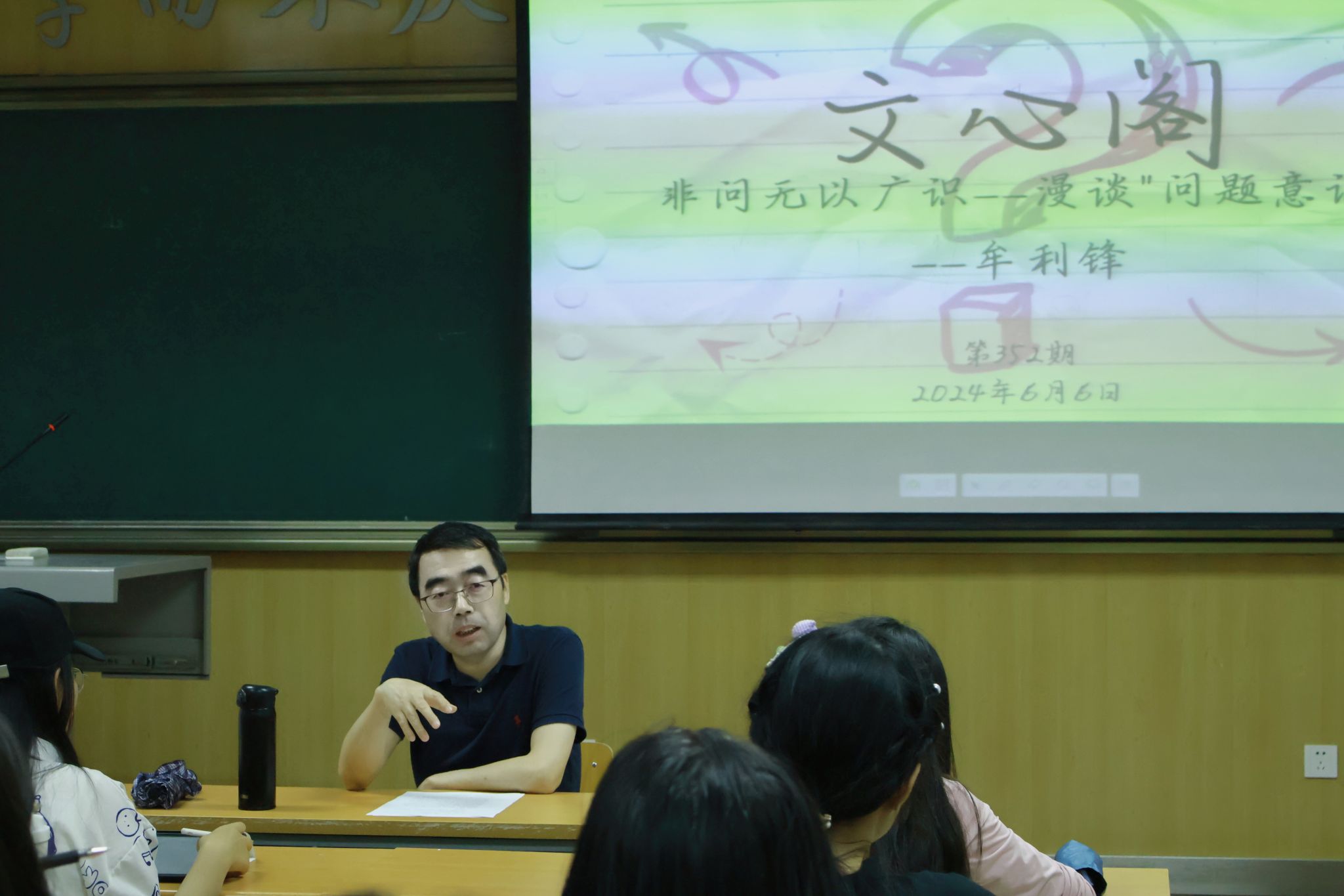 6月6日,本学期第13期(总第352期)文心阁活动在长安校区文渊楼1212室成功举办。申博SUNBET副教授、秘书学教研室的牟利锋老师,以“非问无以广识——漫谈‘问题意识’”为主题,围绕是什么、为什么、怎么做三个方面,与同学们展开分享交流。