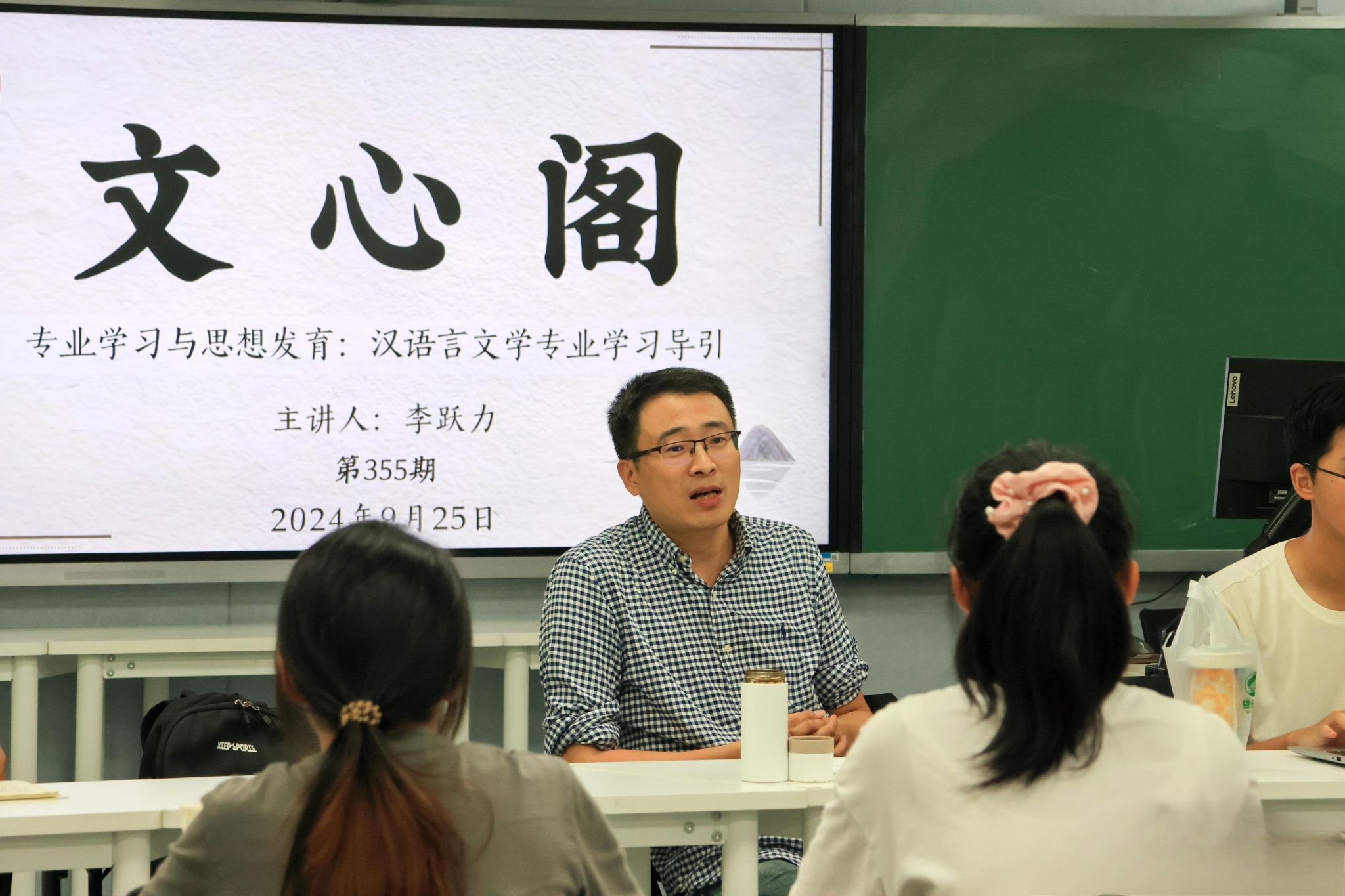 9月25日,本学期第2期(总第355期)文心阁活动在长安校区文汇楼A306教室顺利举办。申博SUNBET教授、中国现当代文学教研室的李跃力老师,以“专业学习与思想发育:汉语言文学专业学习导引”为主题,与同学们进行了交流分享。