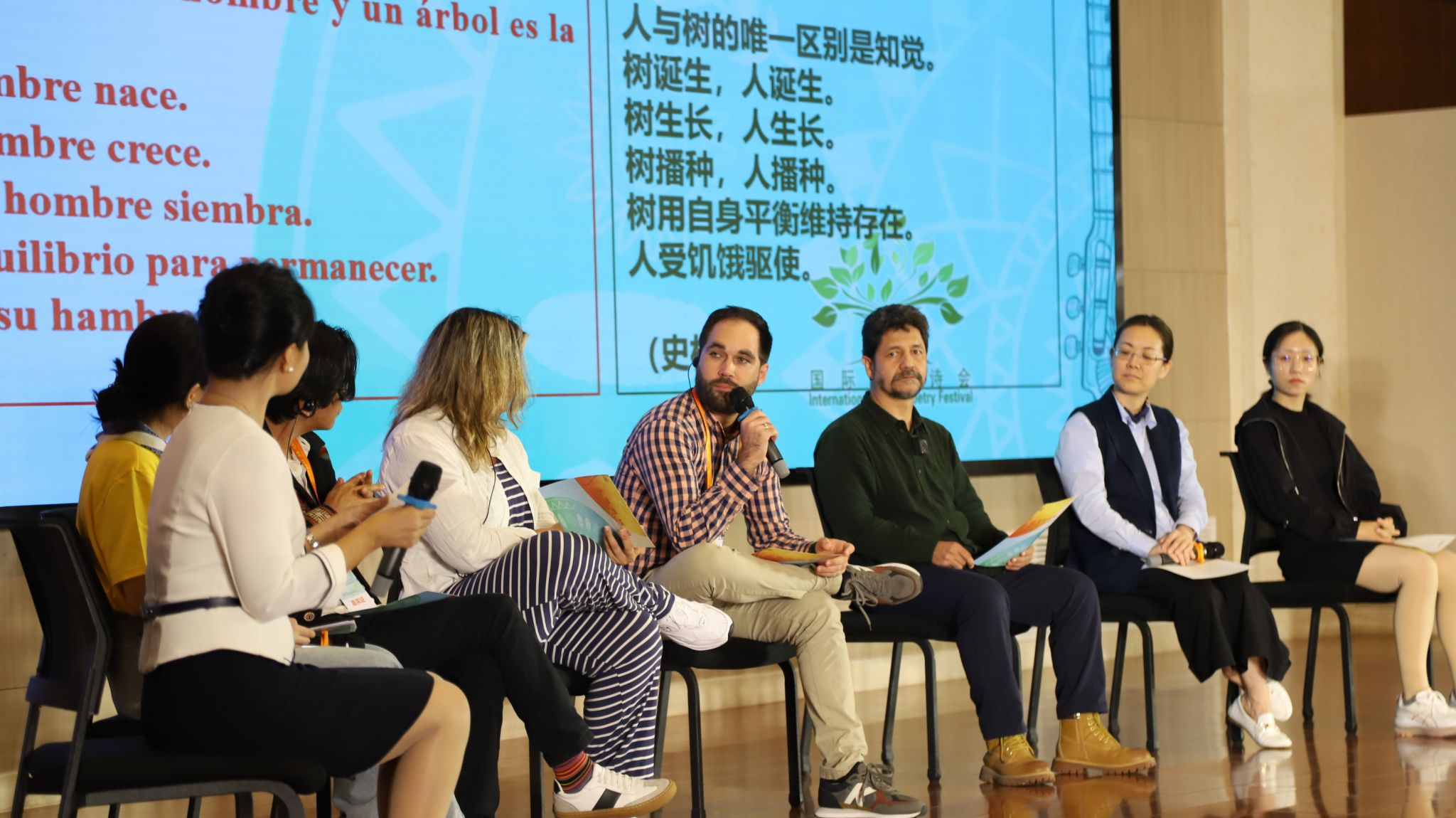 诗歌朗诵交流会分三个单元进行,14位拉美诗人与13位中国诗人分三组依次登台,用母语朗诵诗作,实现真正意义上的“诗语交融”。《不稳定状态》《桥》等作品,在哲学思考与自然意象中交织出生命的厚度;《内心深处》《僧袍》等诗作进一步切入个体与世界的对话,展现青春中的自省、孤独与坚韧;《搏击俱乐部》《爱降临于身体》等诗歌收尾,语言或炽烈或冷峻,皆充满力量与想象。