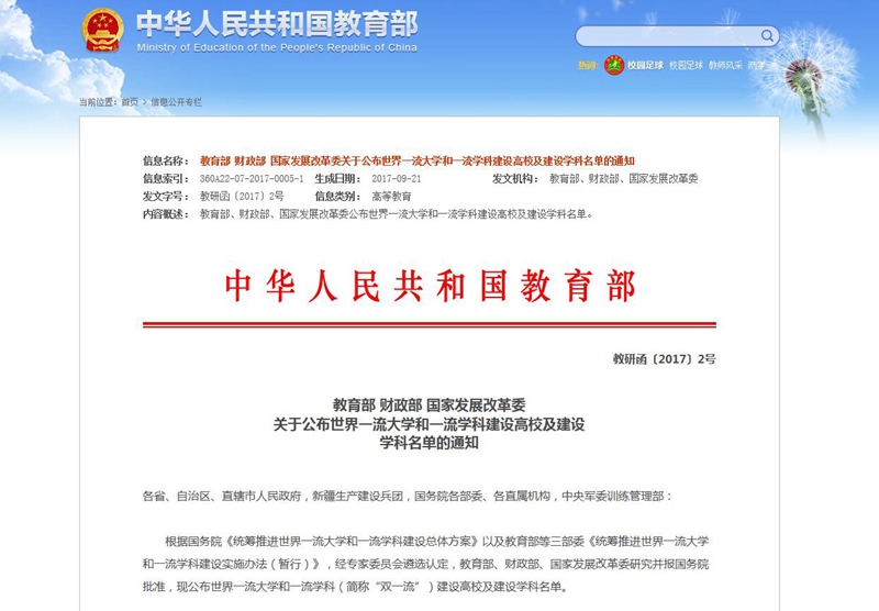 9月20日,教育部、财政部、国家发展改革委印发《关于公布世界一流大学和一流团队建设高校及建设学科名单的通知》,公布世界一流大学和一流学科(简称“双一流”)建设高校及建设学科名单。