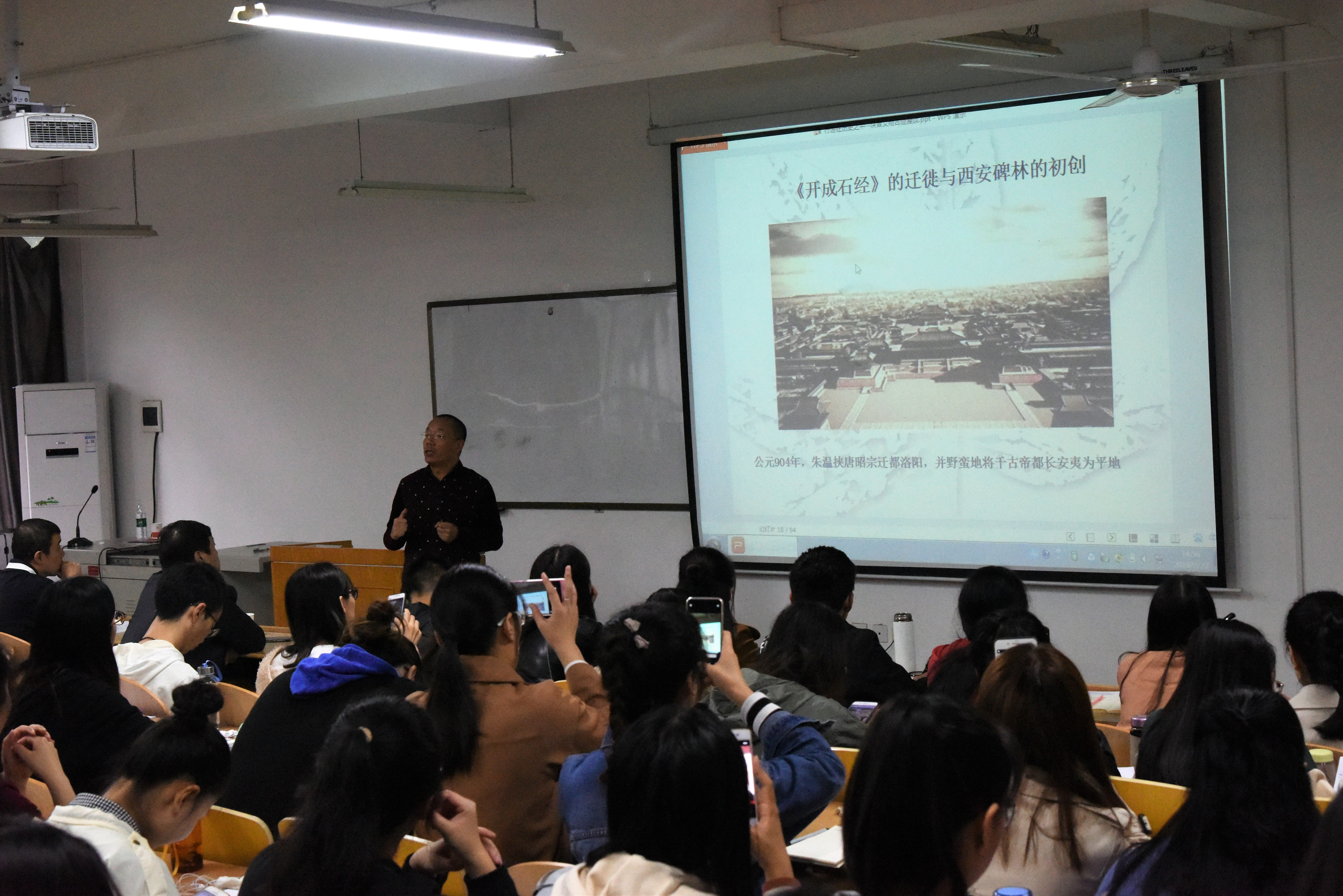陈根远先生的讲座主要有三部分内容:陕西汉中石门摩崖碑刻、西安碑林及山西芮城永乐宫。陈老师首先从陕西四大碑林——汉中石门汉魏摩崖石刻、耀县药王山北朝造像、礼泉昭陵初唐碑志、西安碑林汉唐碑林入手,讲述了陕西碑刻与中国碑刻的渊源关系。西安碑林是本次讲座的重要内容,陈老师从西安碑林的初建讲起,为大家解读了《开成石经》《石台孝经》《峄山刻石》《合阳令曹全碑》《怀仁集王羲之书圣教序碑》《孔子庙堂碑》《皇甫诞碑》《同州三藏圣教序碑》《多宝塔碑》《玄秘塔碑》《大秦景教流行中国碑》等著名碑刻的来龙去脉、真伪辨识、文化内涵,强调了《开成石经》《石台孝经》的重要价值,呼吁同学们树立文物保护意识。最后陈老师从兴建缘起、建筑模式、宗教意义等方面对山西芮城永乐宫进行了介绍,并用图片展示了辉煌的永乐宫建筑群及高超的壁画艺术。