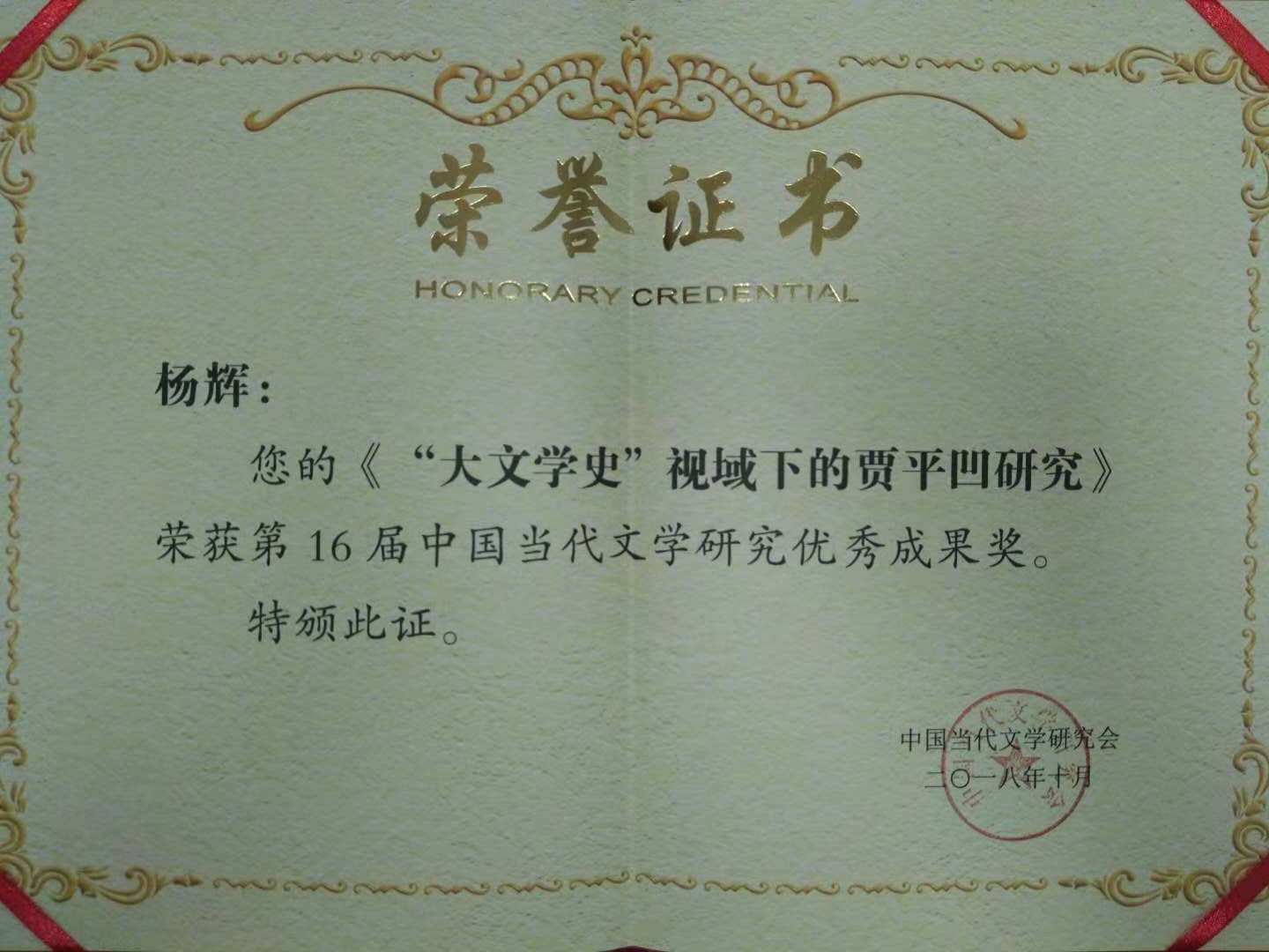 杨辉老师获第十六届中国当代文学研究优秀成果奖