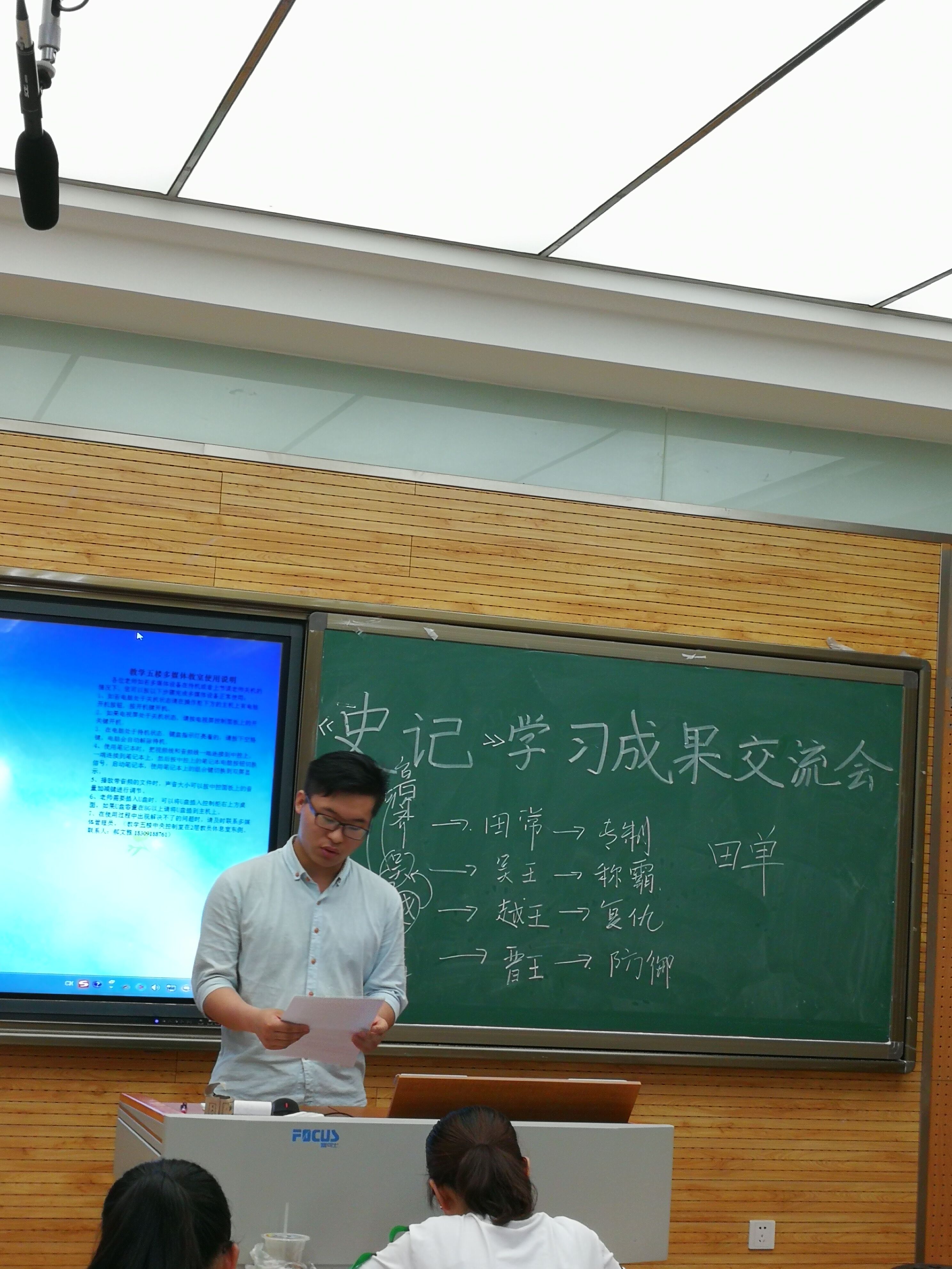 交流会开始,主持人张心宇根据刘老师在作业批改反馈后推选的发言者就发言顺序等做了具体安排,随后就迎来了同学们精彩纷呈的发言环节。同学们以之前所作的《史记》人物传记探究作业为蓝本,分享了自己在研读相关篇章过程中的心得体会与学习成果,吕太后、萧相国、子贡、鲁仲连、商鞅、卫青、田单、乐毅……一个个历史人物在同学们的讲解中都变得生动立体起来,交流中所展现的研究角度和个人立场也对人多有启发,从而有效延伸拓展了课堂教学的内容,弥补了其局限和不足。整个交流会可谓气氛热烈融洽,掌声不断。台上的发言者大方自然侃侃而谈,台下的倾听者则全神贯注,不时常报以肯定的笑声和掌声。将学习的主动权完全交还给员工,是本次交流会最大的亮点。从探究对象的选择到学习成果的展示,同学们都享有着极大的自由空间,在展现个人风格的同时也激发了自主学习的兴趣。从身边同龄人身上学习他们的长处和闪光点,当是本次交流会给同学们带来的最大启发和收获。
