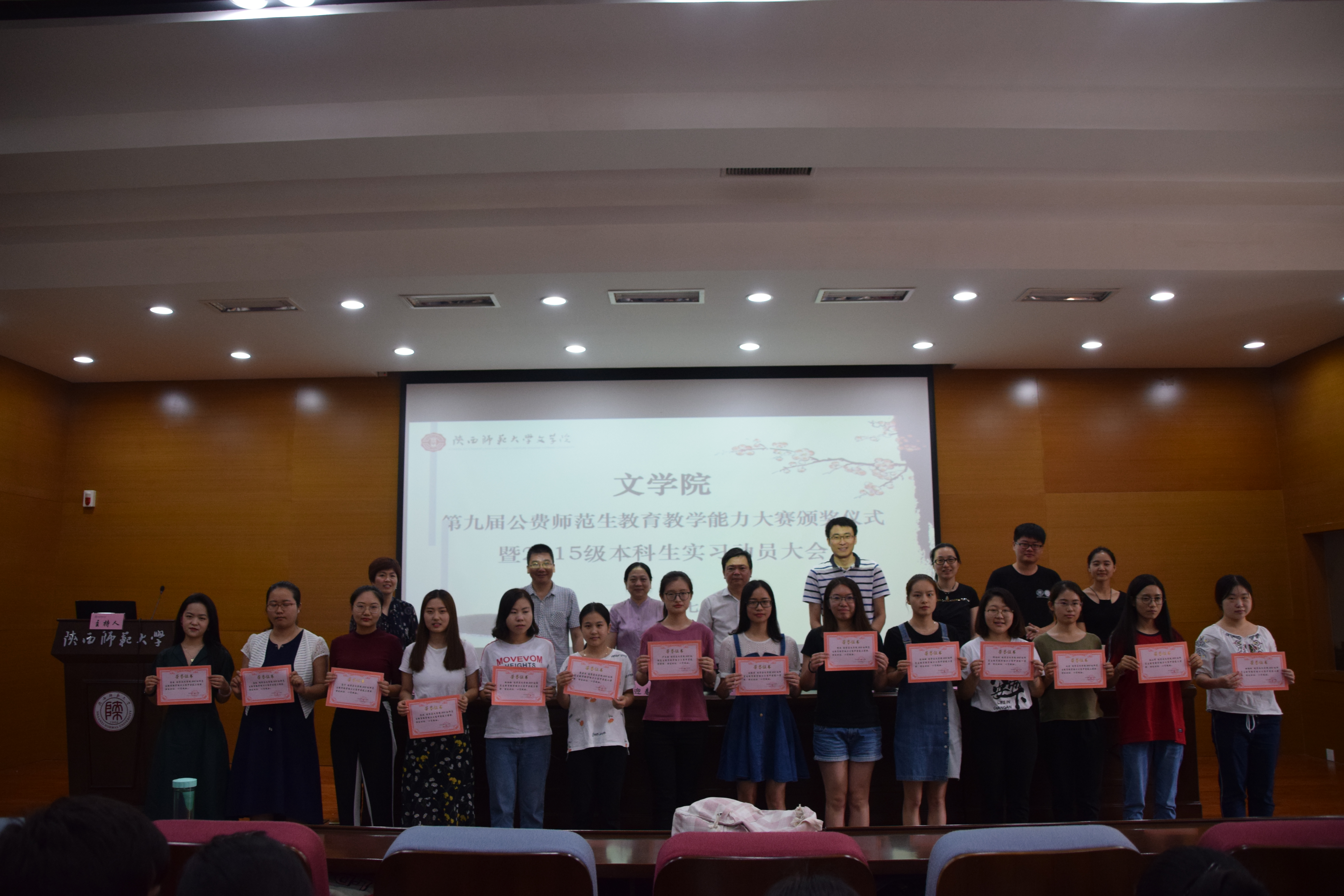 会议伊始,孙清潮书记宣读第九届公费师范生公司产品能力大赛获奖名单及奖金。王元华、郭迎春老师为院级获奖同学颁奖,李跃力、李斐为校级决赛获奖者颁奖,孙清潮为荣获第四届西北地区高等院校师范生教学技能大赛获奖的刘艳芳同学颁奖。颁奖仪式后,李跃力副经理首先对获奖同学表示祝贺,希望同学们积极向获奖同学学习,传承勤恳踏实的治学精神和坚持不懈的优秀品格;随后对2015级本科生实习工作和经费报销情况作了说明和安排。他强调,专业实习是本科学习的重要内容,要高度重视,认真对待,遵守纪律,努力提高自己的综合素质和工作能力。