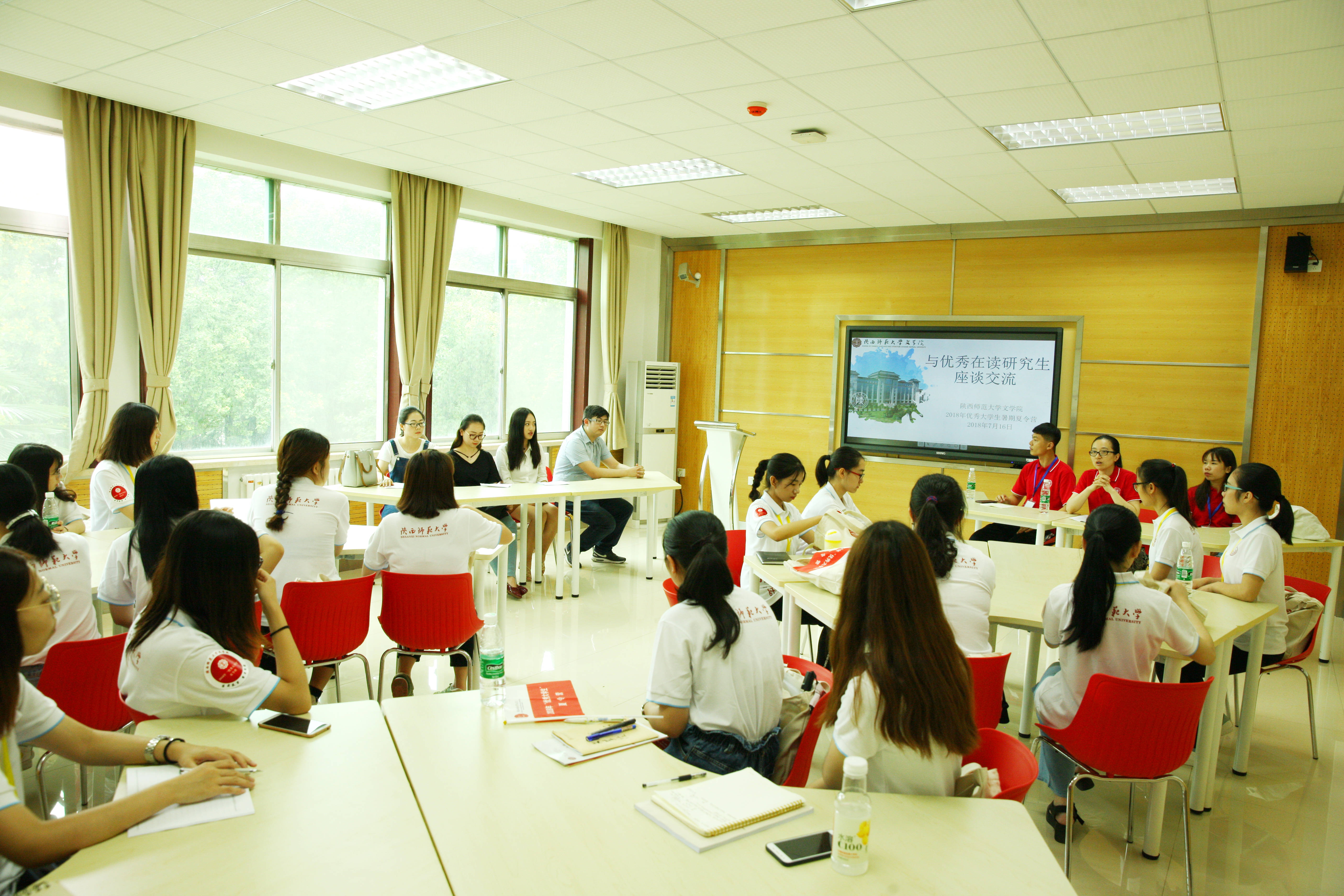 四位在读研究生讲述了自己在陕师大生活和学习的感受和体会。2016级古代文学专业的刘悦同学介绍了申博SUNBET的整体学术氛围和学术风气; 2017级古代文学专业的王旭文和现当代文学专业的黄一晨分别介绍了自己本专业的研究特色和学科魅力;从本科至研究生在申博SUNBET度过了六年的董敏同学从后勤生活、员工活动等方面分享了自己的经历和感受。