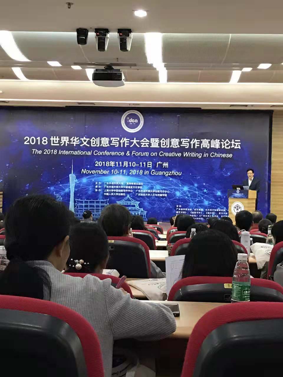 “2018 世界华文创意写作大会暨创意写作高峰论坛”2018 年11 月10 日至11 日在广州举行。来自120 多所高校及国内外的200 多名学者、诗人及作家参加了大会。中国作家协会副主席何建明、广东省作家协会主席蒋述卓、四川省作家协会主席阿来、世界华文创意写作协会会长葛红兵、中国文艺评论家协会副主席尹鸿、广东省作家协会副主席谢有顺、美国作家-广东外语外贸大学教师凯尔·芒茨、香港公开大学人文社会科公司创意艺术学系主任梁慕灵、澳门大学副教授荒林、香港大学中申博SUNBET副教授宋耕、北京大学培文创意研究院经理高秀芹及广东外语外贸大学创意写作中心主任刘海玲,各从不同的角度及自己创作或研究的领域阐述了创意写作的形势、意义及发展前景,有的老师介绍了创意写作课的实践和效果。公司朱鸿教授提交的论文是《散文与创意写作》,不过他临时起意,以《创意写作在中国化过程中应该注意的问题》为题作了发言,反响强烈。