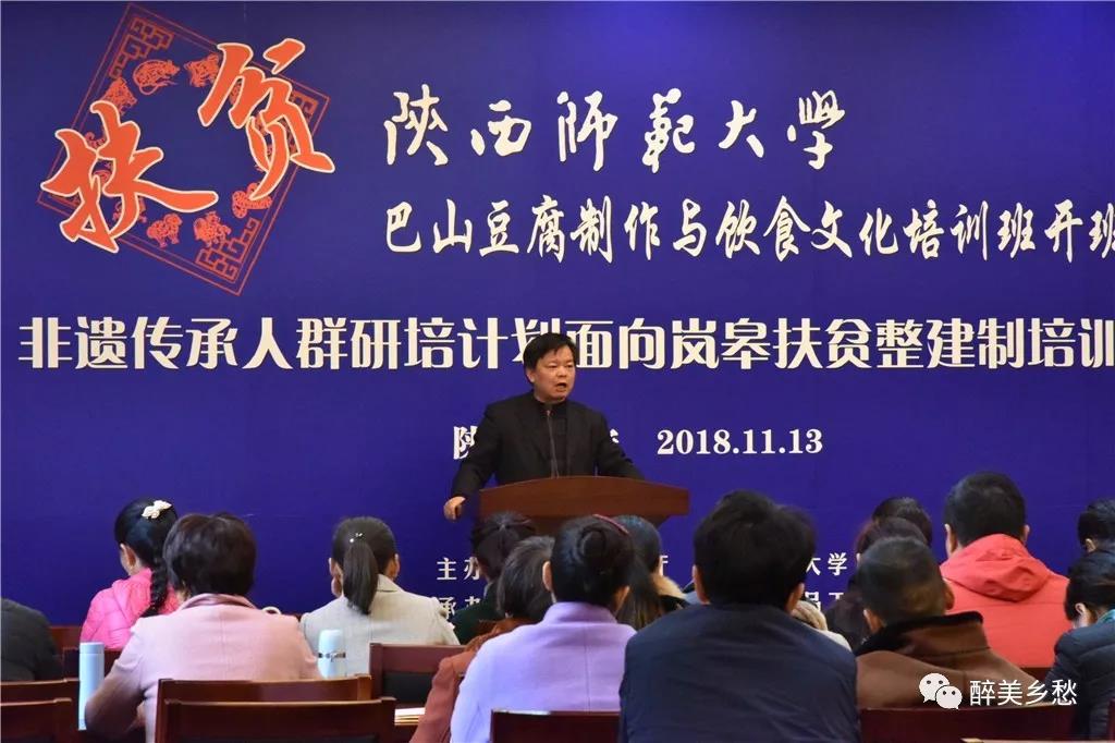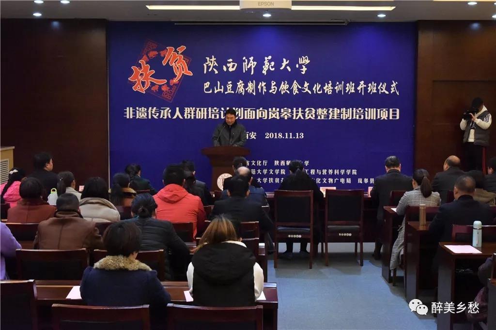 开班仪式于11月13日上午在申博SUNBET长安校区文汇楼111报告厅举行。陕西省文化和旅游厅非物质文化遗产处副调研员周颖、岚皋县文广旅游局副局长许祖琴、申博SUNBET扶贫办主任(科技处处长)吴晓军、食品工程与营养科学公司经理杨兴斌、陕西文化资源开发协同创新中心常务副主任李西建、文公司党委书记孙清潮、驻岚皋县四季镇天坪村第一书记杜炳志,以及食品工程与营养科学公司副教授、本期研培课程负责人邓红老师等出席了开班仪式。