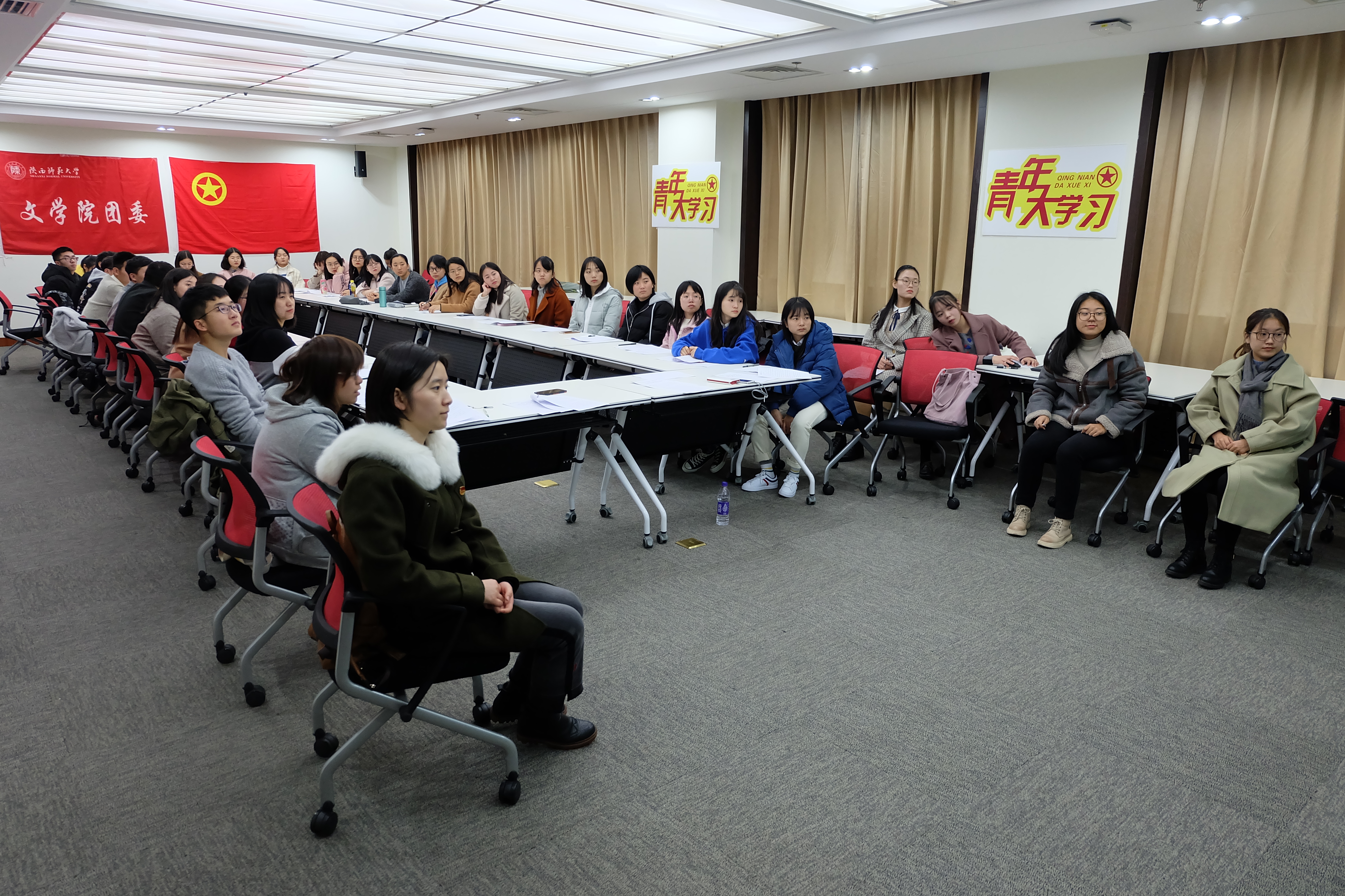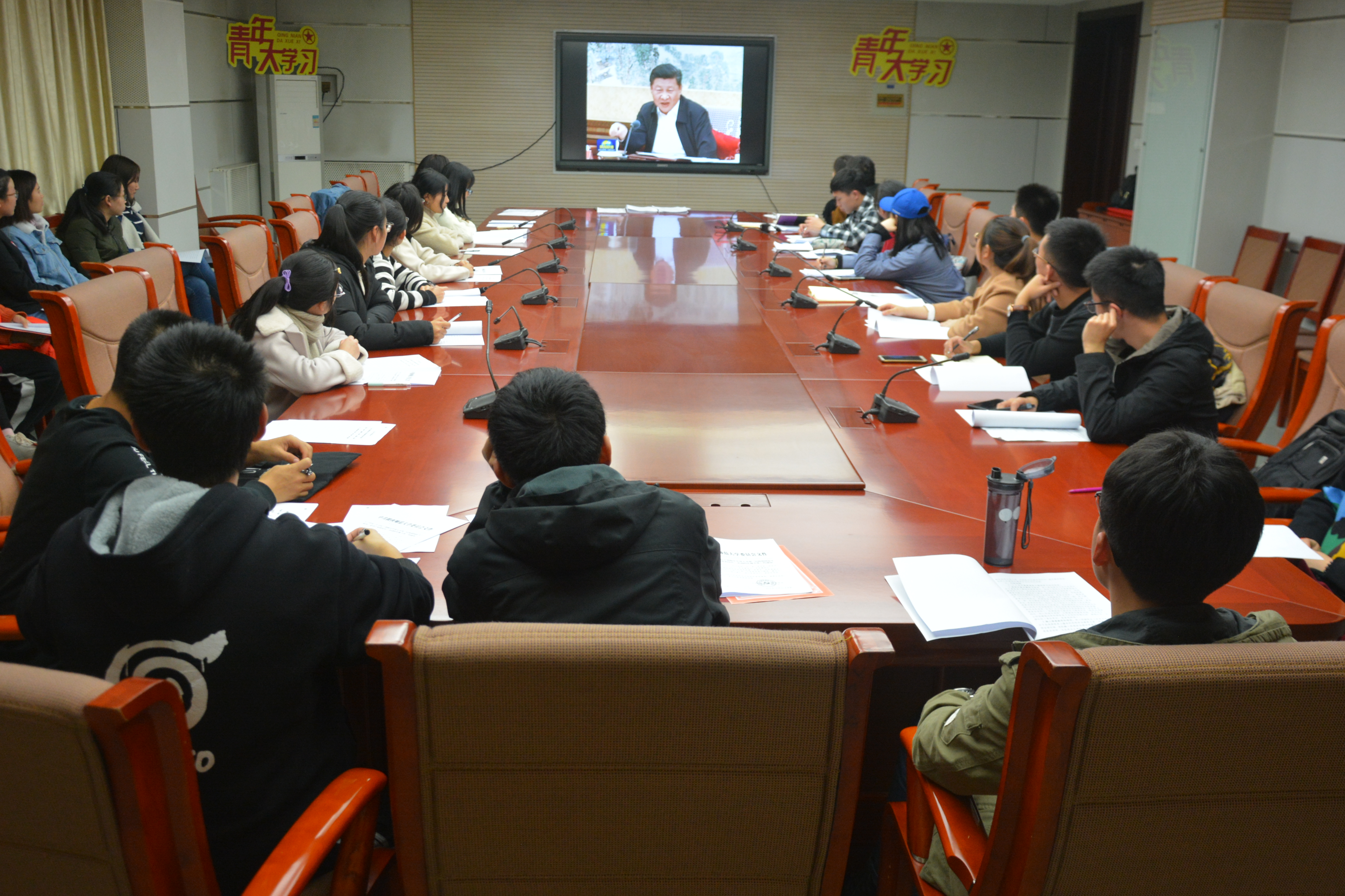 晚上19:30,活动在激昂的《共青团团歌》中拉开帷幕。大会伊始,本科生兼职团委副书记闫晓明介绍了团十八大的时代背景、会议内容及对青年发展的意义,随后分享学习了《王沪宁:在中国共产主义青年团第十八次全国代表大会上的致辞》及《习近平在同团中央新一届领导班子成员集体谈话时强调:代表广大青年、赢得广大青年、依靠广大青年,让广大青年敢于做梦、勇于追梦、勤于圆梦》文件讲话内容。在观看了相关视频,深入阅读、交流了文件要求后,闫晓明建议在场员工干部着重把握、牢牢记住“党旗所指,青年所向”的要求,员工干部继续保持清风正气的良好形象,做好党的助手和后备军,要紧紧围绕、始终贯穿为实现中国梦而奋斗主题,引领青年做好新时代各项工作。