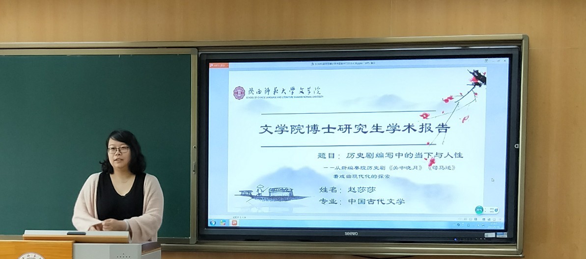 第96场博士学术报告以《历史剧编写中的当下与人性》为题,由中国古代文学专业博士研究生赵莎莎主讲。赵莎莎以新编秦腔历史剧《关中晓月》、《司马迁》为主探索戏曲现代化问题。报告内容分为三部分:第一部分,详细论述了选题缘由;第二部分,界定了戏曲现代化和历史剧两个概念。第三部分,以《关中晓月》和《司马迁》为例,分析近年来秦腔新编历史剧呈现火热状态的原因,并从编剧角度看人性与历史的交汇以及戏剧故事中的“实”与“虚”,接着她探讨了两部戏剧的共同主题:文道与皇权的交锋。最后,她引用了意大利历史学家贝奈戴托·克罗齐所提及的“一切历史都是当代史”和柯林伍德的名句“一切历史都是思想史”作结。赵莎莎还分享了一些学术资源的使用方法和写论文摘要的技巧。报告现场互动频繁,许多同学都说这场报告“干货十足”。