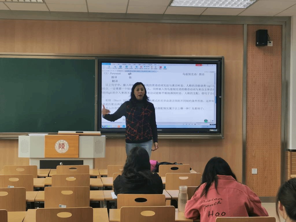 第104场博士学术报告以《维吾尔语中的汉语嵌入动词研究》为题,由语言学及应用语言学专业博士研究生早热古丽·阿不力米提主讲。她从嵌入印地语句法系统的英语动词、嵌入乌兹别克语的俄语动词和嵌入维吾尔语的汉语动词三者的对比入手,提出汉语客体动词与维吾尔语主体框架的搭配需要来自主体语动词的介入来消灭缓冲,才能使外来动词平顺地得到时态、人称的支配,语句合乎句法。