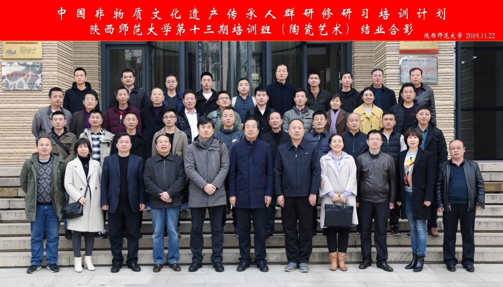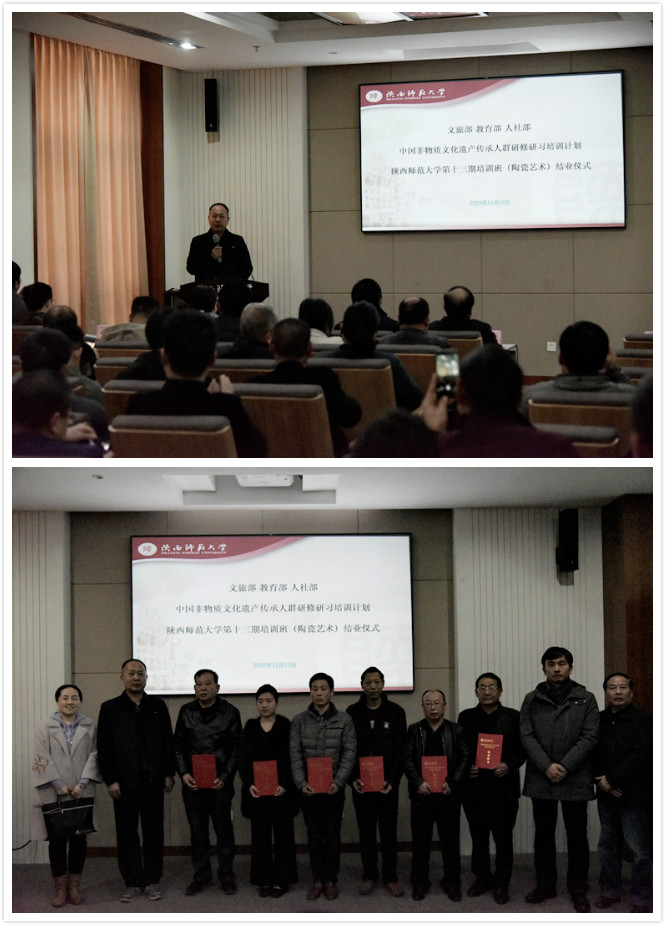 (通讯员 陈丹玉)2019年11月22日,文化和旅游部、教育部、人力资源和社会保障部中国非物质文化遗产传承人群研修研习培训计划(以下简称“研培计划”)申博SUNBET第十三期培训班(陶瓷艺术)结业仪式暨学员结业作品展览在长安校区隆重举行。陕西省文化和旅游厅副厅长顾劲松、非物质文化遗产处副调研员周颖,申博SUNBET副董事长党怀兴等出席结业仪式并参观了学员的结业作品展览,同时向学员们颁发了结业证书,向优秀学员颁发了荣誉证书,共同观看了申博SUNBET“研培计划”就业创业先进学员微视频。