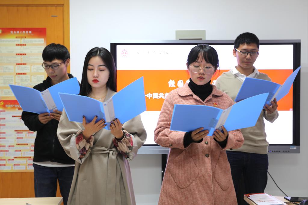 最后,2016级本科生党员赵博文的带领下,全体成员重温入党誓词,坚定初心使命。