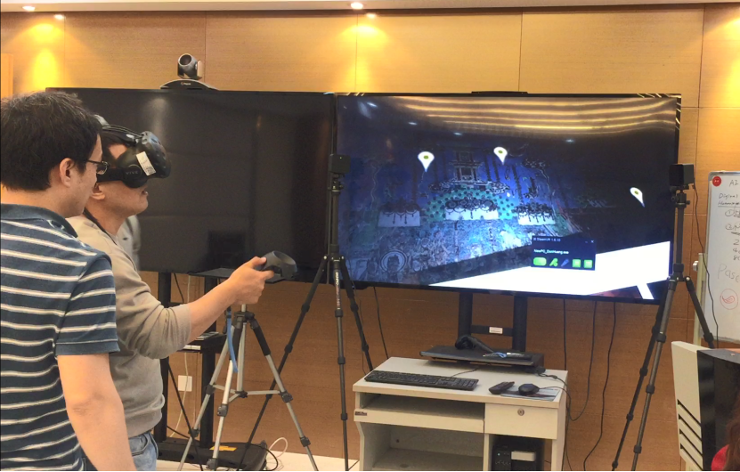 随后,张光伟详细介绍了他们目前的虚拟仿真实验教学项目——《敦煌石窟历史实践教学虚拟仿真实验》。员工首先通过课堂教学和实地考察的方式学习敦煌石窟历史的基础知识,然后通过虚拟仿真实验及佩戴VR外设等形式对敦煌石窟进行沉浸式、体验式学习,虚实结合有效提升学习效果。除了基础知识学习外,该项目还融入Minecraft的操作,让员工能够自己动手来搭建、挖掘石窟,能够进一步理解敦煌石窟与丝绸之路沿线历史的联系。