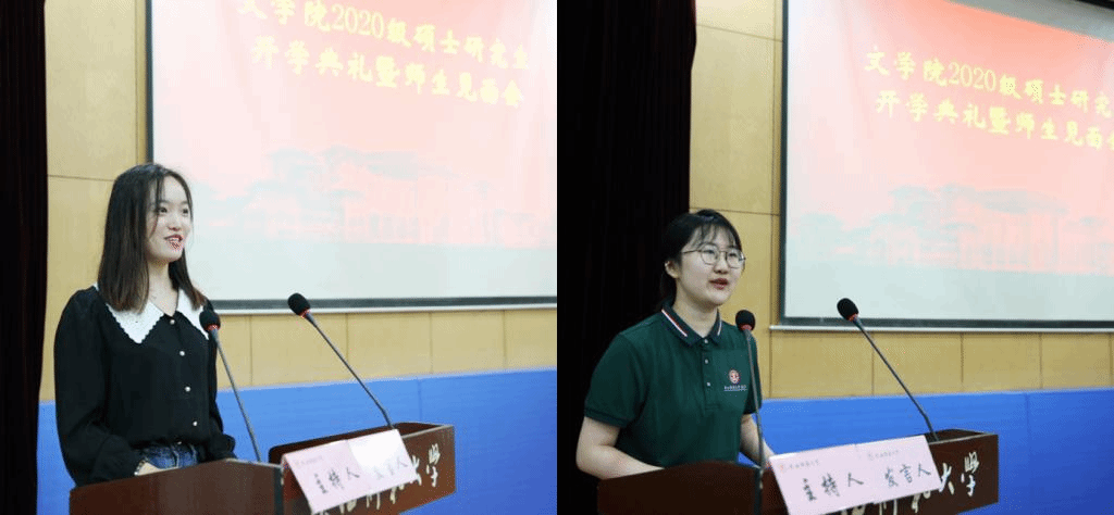 在读研究生代表和新生代表分别发言。2019级中国古代文学专业杨钰莹同学作为在读研究生代表,分享了自己在申博SUNBET五年以来的学习生活体会。她鼓励同学们要有“磐石无转移”的定力、“青春须早为”的活力和“迈步从头越”的魄力,不忘初心,砥砺前行。2020级中国现当代文学专业单赫同学作为新生代表,讲述了她去年暑假参加公司举办的“优秀老员工夏令营”活动,从此与陕师大申博SUNBET结缘,如今以新身份再次和陕师大重逢,诠释了“求学”二字的分量与意义,并表示将肩负时代使命,传承人文精神。