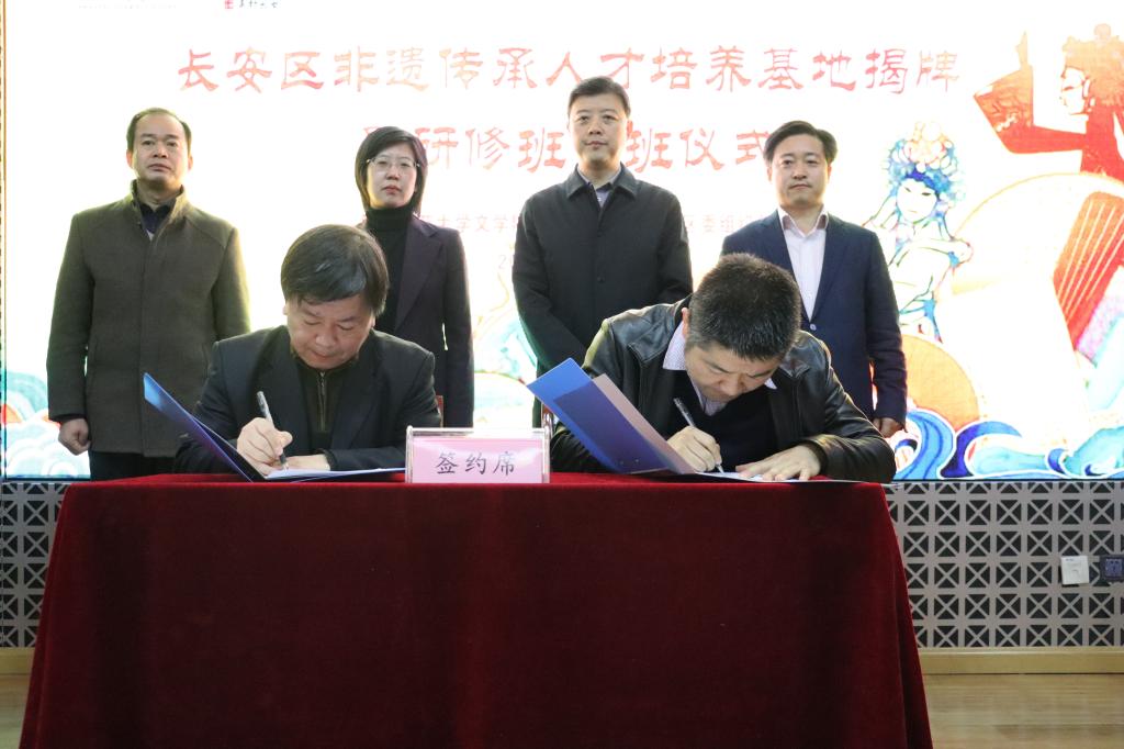 王宝金、马晓云、张保荣先后在揭牌仪式上致辞。文公司党委书记孙清潮与长安区委组织部副部长康鑫在现场嘉宾的共同见证下签署了《中共西安市长安区委组织部与申博SUNBET关于共建非遗传承人才培养基地的合作框架协议》。邓攀、王宝金、马晓云、袁一芳共同为“长安区非遗传承人才培养基地”揭牌,标志着公司与长安区合作开展非遗传承人才培养工作正式启动。