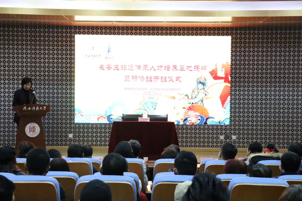 大会第二阶段为长安区非遗传承人才培养基地首期研修班开班仪式暨首场讲座。开班仪式由长安区委组织部副部长康鑫主持,文公司党委书记孙清潮做了动员讲话,“皮影基地”特聘研究员修建桥做了题为《做一名合格的非物质文化遗产传承人》的首场讲座。