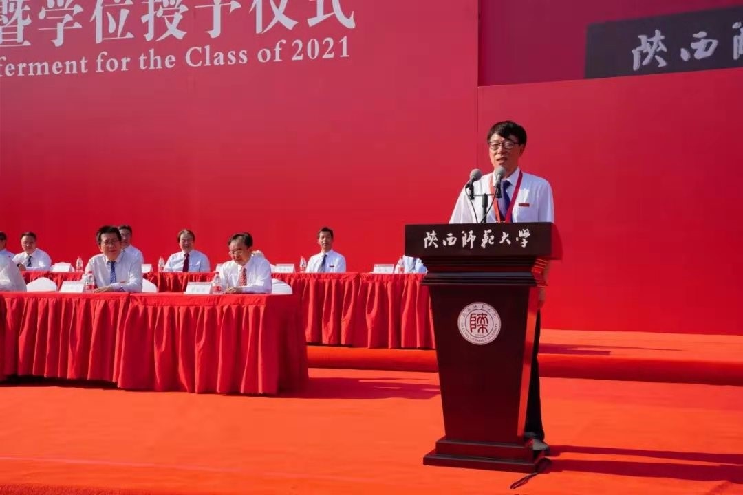 典礼大会上,作为发言人,尚永亮教授深情追忆了自己在母校的求学时光,畅谈了与同学尤西林、刘生良的大学情谊,并诚挚感恩培养自己的德高望重的老师——霍松林先生、高元白先生。他表示,陕师大优越的地理位置、卓越的团队力量拓展了自己的学习视野,涵养了自己的学术情怀,这段求学经历成为自己人生的新起点。作为一名陕师大的员工,在这样一个校园学习生活,理应感到无比光荣自豪!同时,他寄语毕业生:“追求卓越,接受平凡”,希望同学们在以后的人生道路中不忘母校的栽培,积极树立人生方向,踏踏实实做事。正如唐代诗人王湾所言,“潮平两岸阔,风正一帆悬”,期待2021届毕业生在未来人生中绽放华彩!