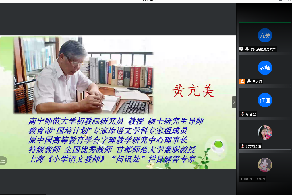 (通讯员:曹亚敏)2021年5月13日晚,“教师教育研习·名师讲坛”系列讲座第七场顺利举办。本场讲座特别邀请了南宁师范大学研究员黄亢美老师主讲,题目为“高师生应具有的汉字文化素养”。本次讲座由申博SUNBET教授贺卫东老师主持,通过腾讯会议线上开展,申博SUNBET大三、大四师范生聆听了本次讲座。