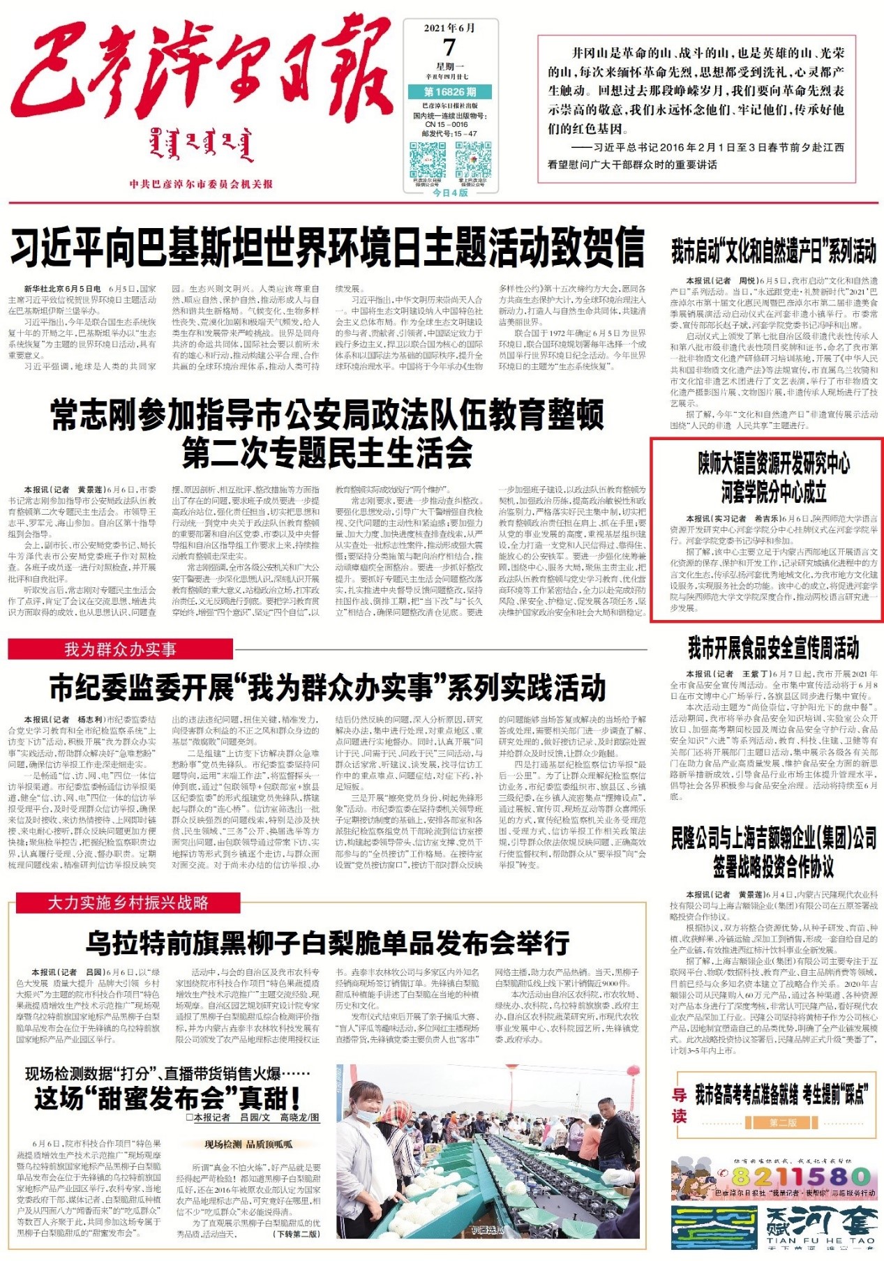 语言资源开发研究中心河套公司分中心的成立,受到了内蒙古巴彦淖尔市新闻部门的关注。《巴彦淖尔日报》6月7日在首页刊登了分中心挂牌仪式的新闻。