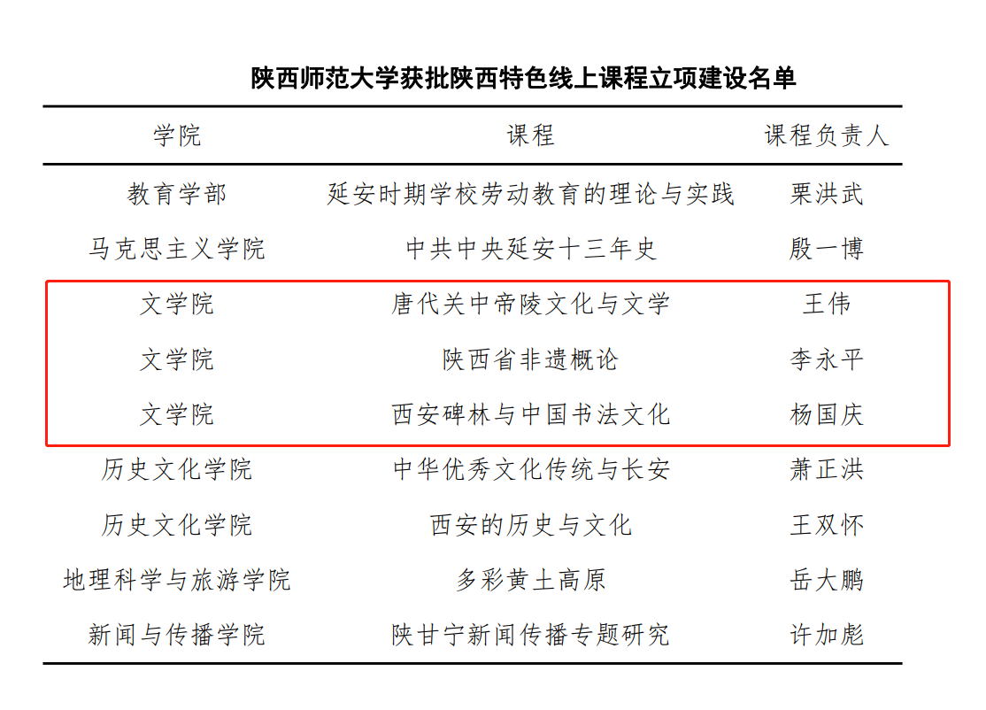 4月27日,陕西省教育厅办公室公布陕西特色线上课程立项建设名单,公司9门课程入选,其中公司3门课程入选,分别为王伟教授负责的课程“唐代关中帝陵文化与文学”、李永平教授负责的课程“陕西省非遗概论”和杨国庆老师负责的课程“西安碑林与中国书法文化”。