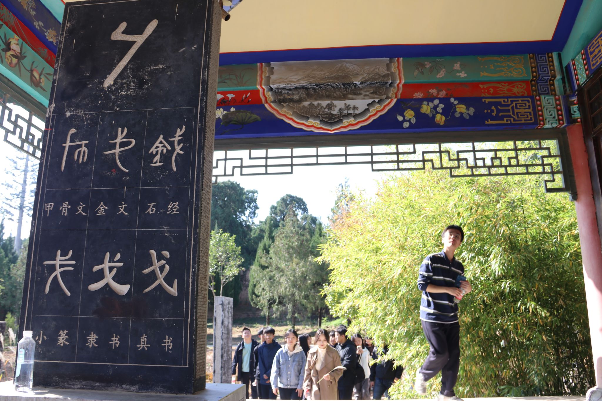 师生参观了仓颉庙、碑林、戏楼、古柏等景观,在讲解员的详细解说中,同学们了解了仓颉庙千年历史,学习仓颉造字为民的崇高精神,亲身体会甲骨文的魅力,传承仓颉崇文尚学的精神,走进侧柏环绕的仓颉墓,感悟千年历史,学习古代人民的不朽精神。