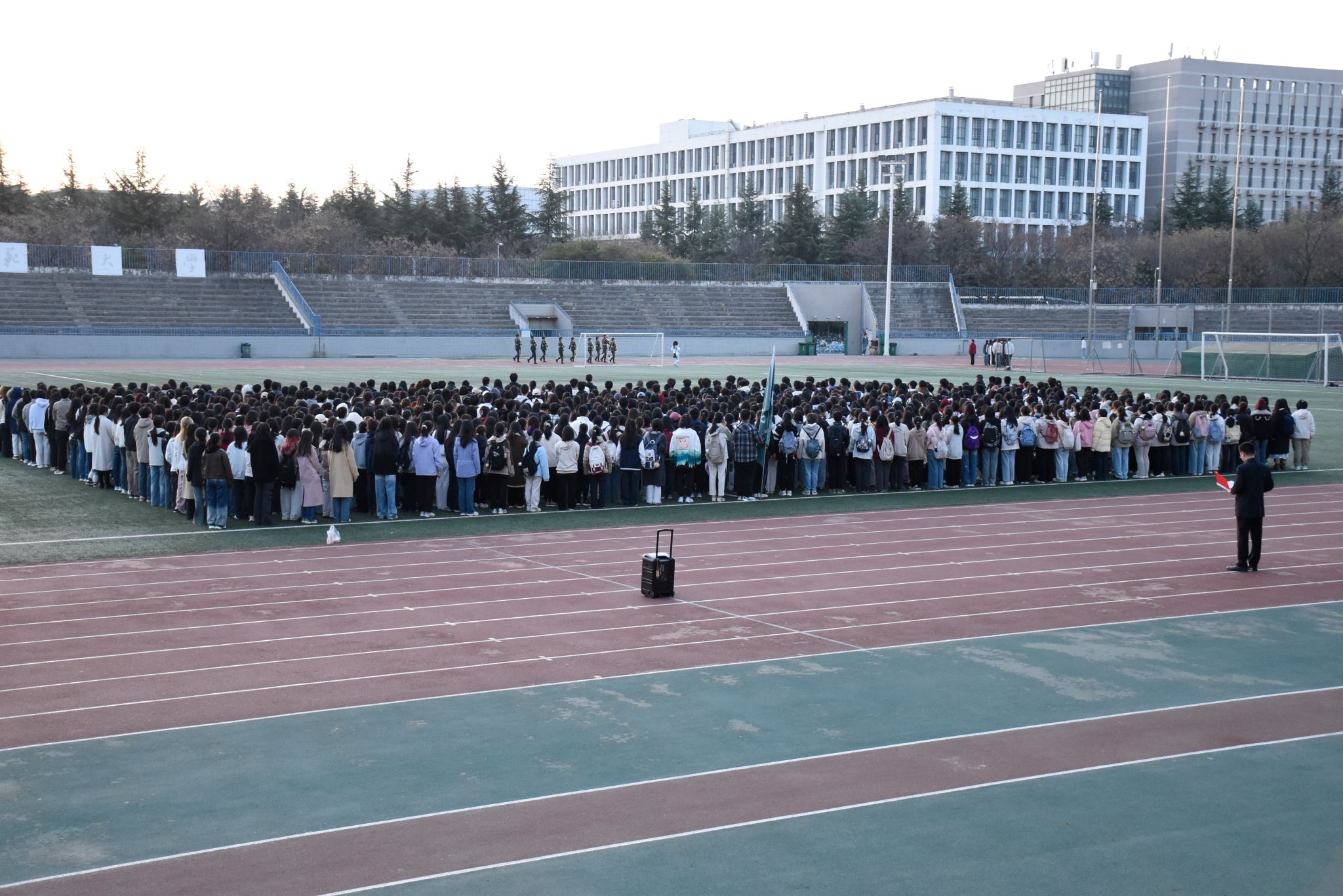 晨光熹微,绿茵场上一派庄严肃穆。国旗护卫队迈着有力的步伐,护卫着五星红旗走向升旗台。伴随着雄壮的《义勇军进行曲》,五星红旗冉冉升起,全体师生行注目礼,齐声高唱国歌。