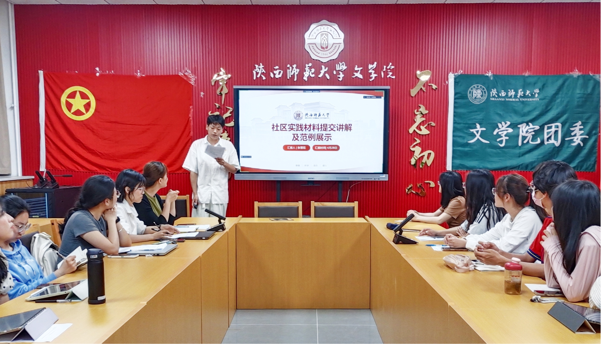 会议在团歌声中拉开序幕。汉语言文学2022级卓越班团支书周媛媛和2023级研究生第五团支部团支书赵倩做团支书代表发言,就如何办好团日活动,准确传达党团思想,进行了经验交流及心得分享。张晋菘和张乐晨分别从老员工社区实践过程以及后期的材料提交,共青团推优入党流程以及注意事项两个方面进行说明。